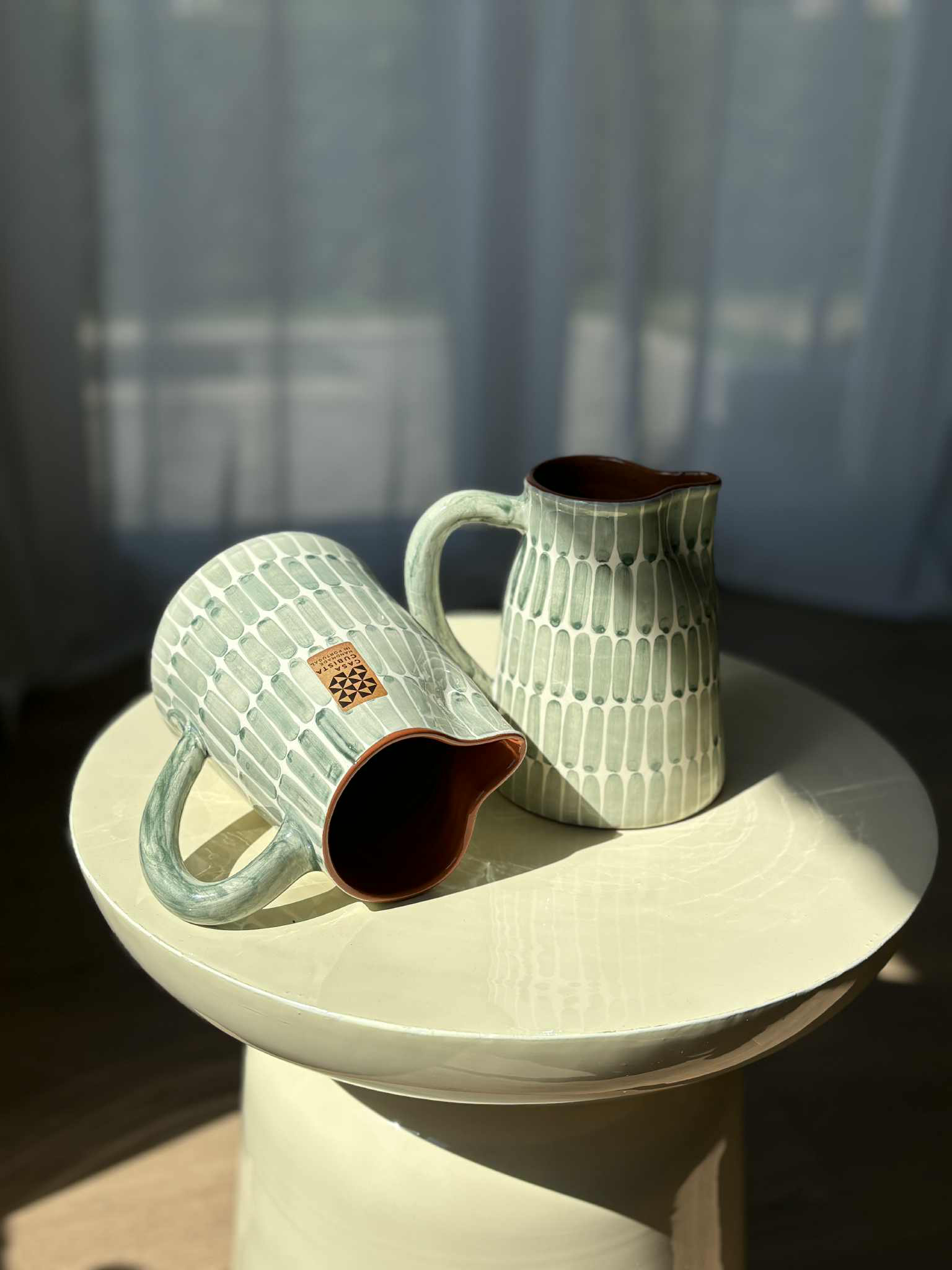 Cette cruche en céramique artisanale incarne le charme méditerranéen. Fabriquée à la main au Portugal, elle allie fonctionnalité et esthétisme.