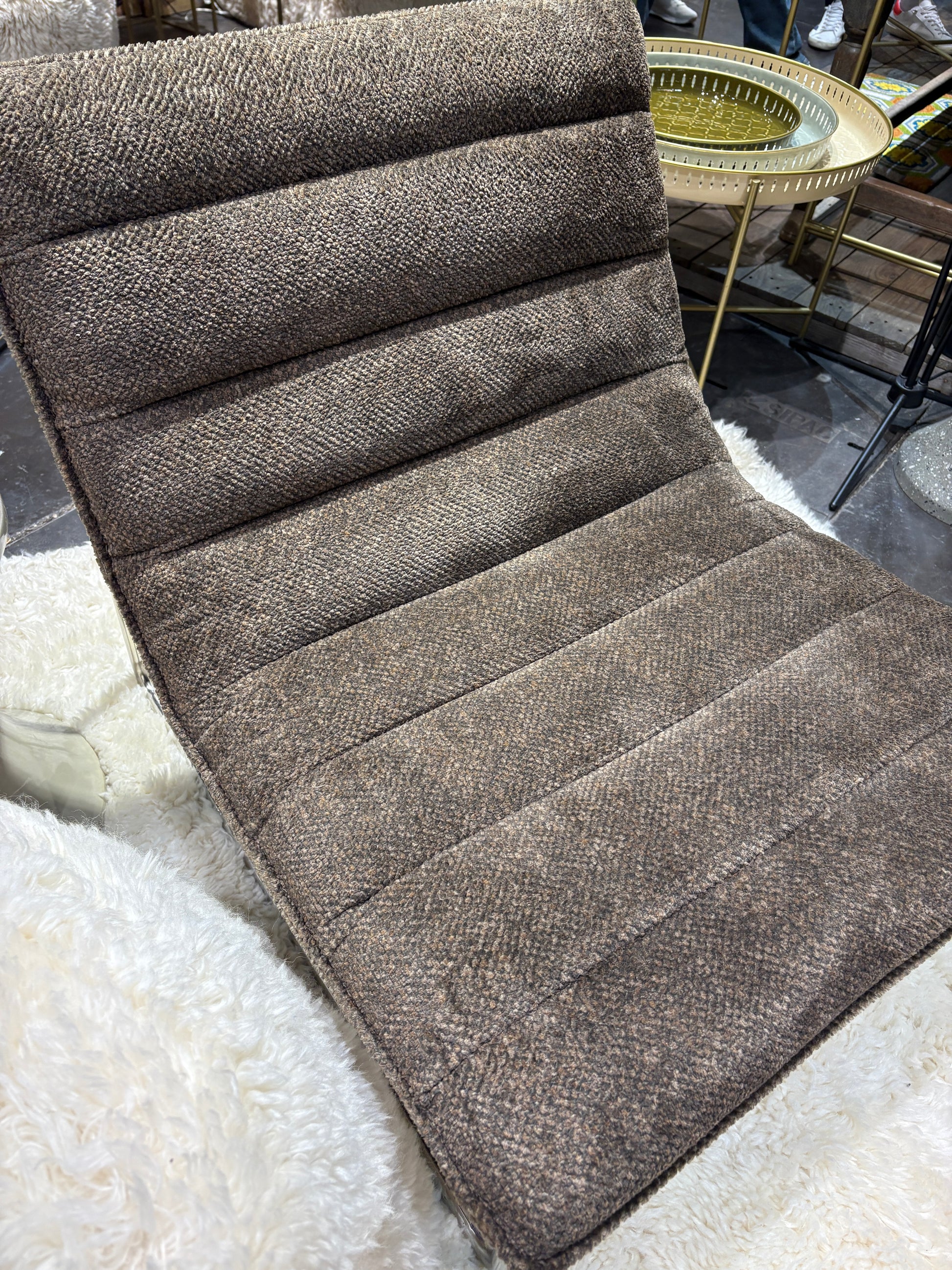 L’assise et le dossier sont constitués d’un seul coussin rembourré, recouvert d’un tissu brun foncé texturé avec des coutures horizontales. Le fauteuil est bas et légèrement incliné vers l’arrière, pensé pour offrir confort et détente tout en conservant une esthétique élégante et contemporaine.