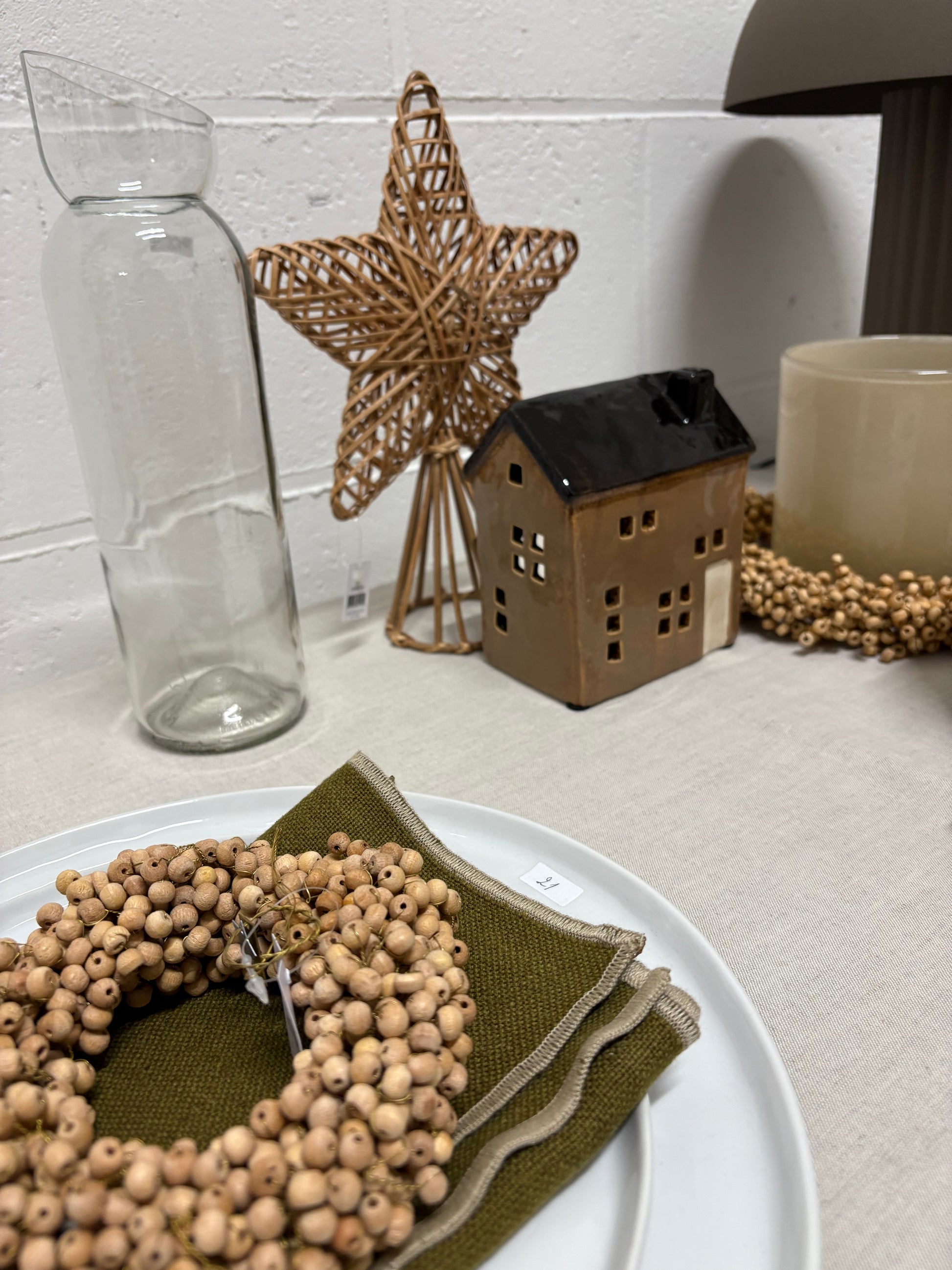 La couronne est soigneusement faite à la main et les nombreuses perles de bois lui donnent une présence chaleureuse, parfaite pour créer une ambiance de Noël ou comme élément décoratif tout au long de l’année.