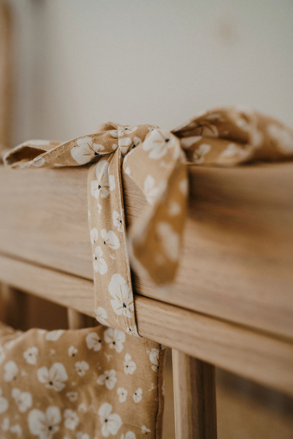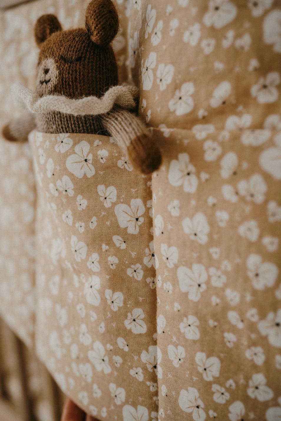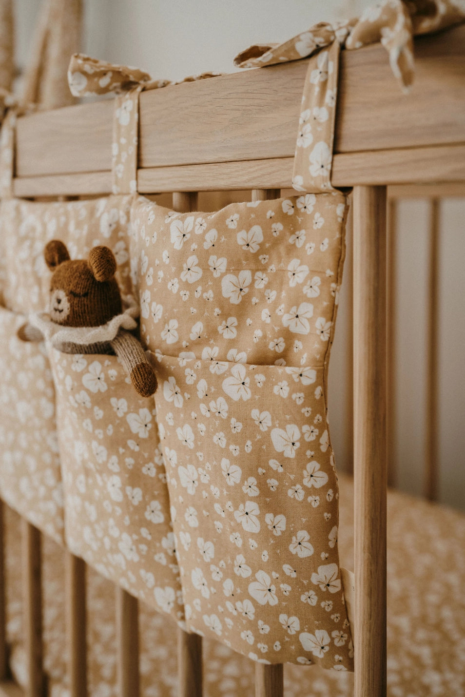 Cette pochette de lit pour bébé est l'accessoire pratique et élégant pour organiser les essentiels de votre tout-petit. Confectionnée en double gaze de coton, elle est douce au toucher et s'intègre parfaitement à la décoration de la chambre. Ses poches spacieuses permettent de ranger les doudous, tétines et autres indispensables, toujours à portée de main pour le coucher de bébé. Avec ses motifs délicats et intemporels, cette pochette allie fonctionnalité et esthétisme, simplifiant la routine du soir.