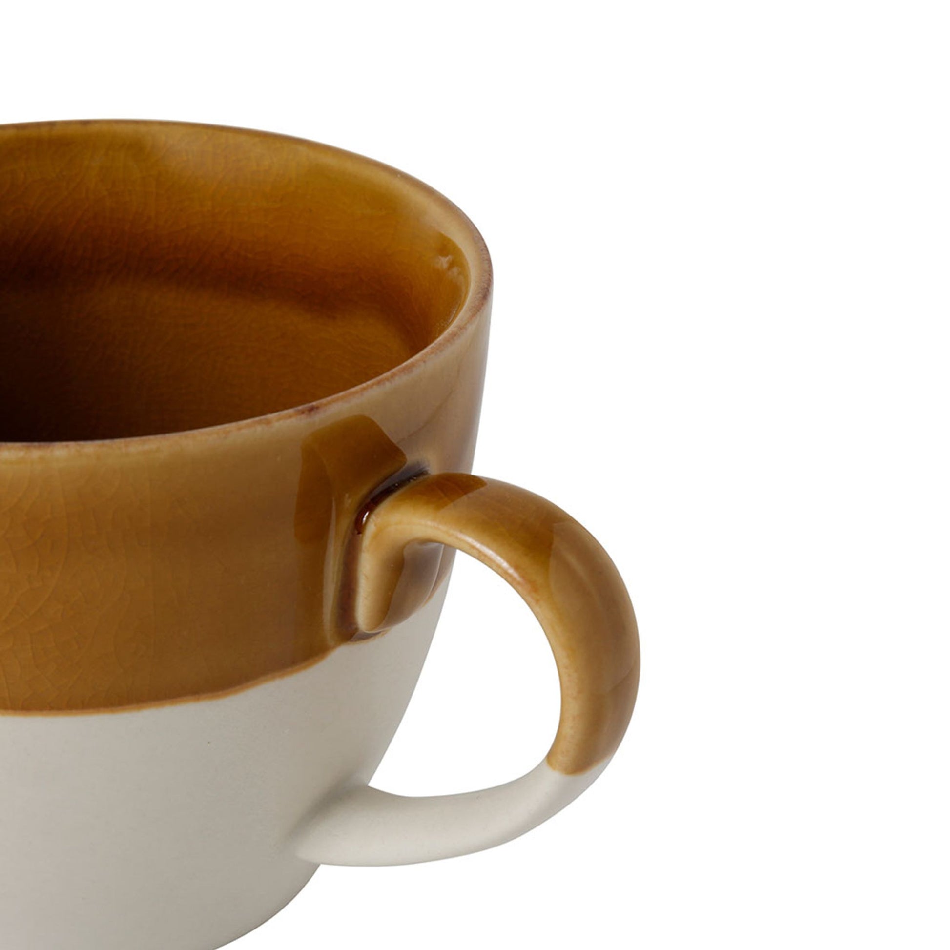 Un format généreux et une palette douce pour cette tasse en grès qui évoque la chaleur des petits plaisirs quotidiens. Le contraste entre la base blanche mate et le haut glacé couleur moutarde crée une pièce pleine de caractère.